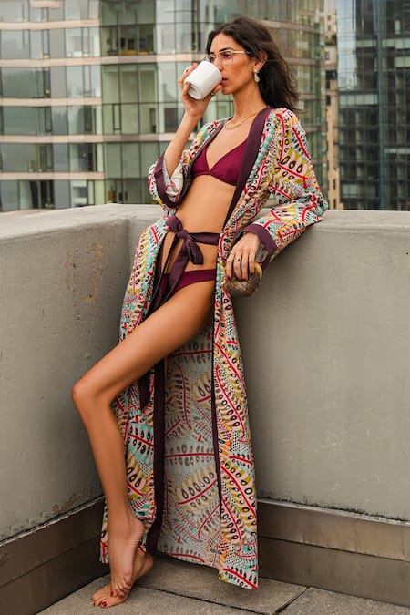 Multi color cover up jacket featuring an all-over abstract print