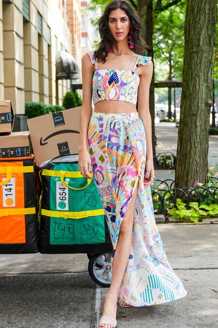 Multi Color Crepe Print Abstract Square Neck Top With Side Slit Pant