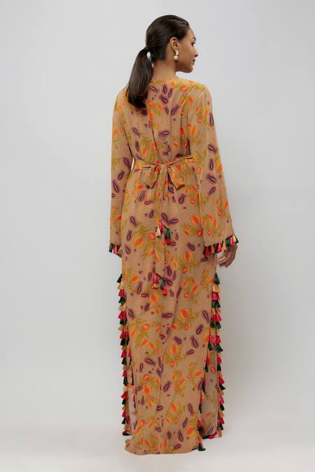 Brown Crepe Tassels Round Neck Anaar Jaal Print Beyza Kaftan