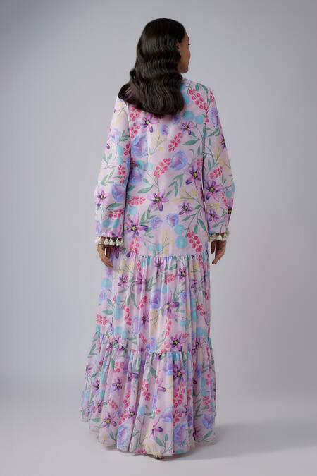 Pink Art Georgette Print Blossom Round Neck Tiered Maxi Dress
