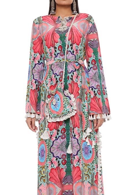 Pink kaftan featuring an enchanted print with a notched neckline and full sleeves. Comes with a matching belt and tassel detailing along the hemline.