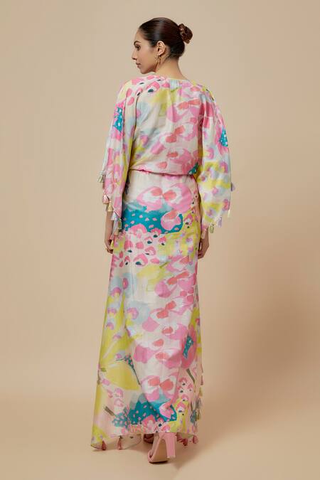 Lime green & multi color kaftan featuring batwing sleeves and a V neck