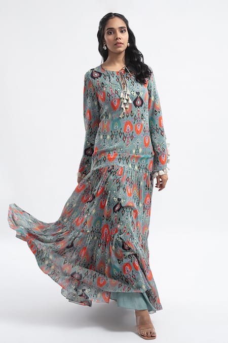 Blue Art Georgette Ikat Garden Motif Round Print Tiered Dress