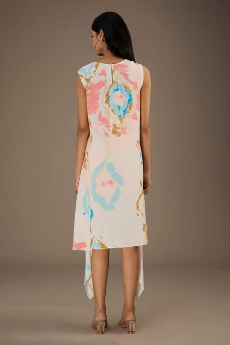 White Crepe Round Neck Ikat Splash Print Asymmetric Dress
