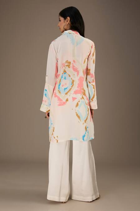 White long shirt featuring scattered ikat splash prints in multiple colors