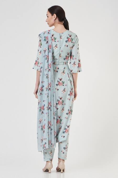 Pale blue dhoti saree with all-over gulabi print, pleats in front and pockets on the sides. Comes with blouse.