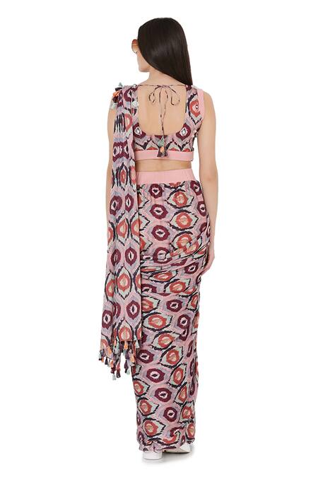 Red Art Silk Printed Ikat Eye Motif U Neck Pre-stitched Saree With Blouse