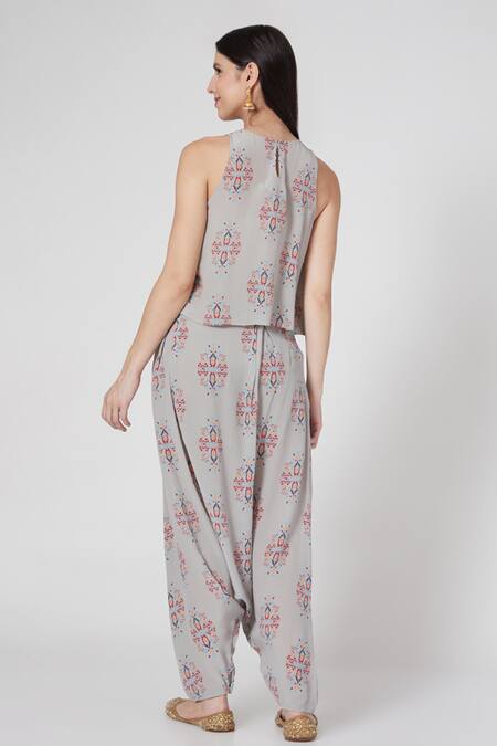 Grey top with ikat buti placement prints and keyhole back. Comes with co-ordinating low crotch pants.