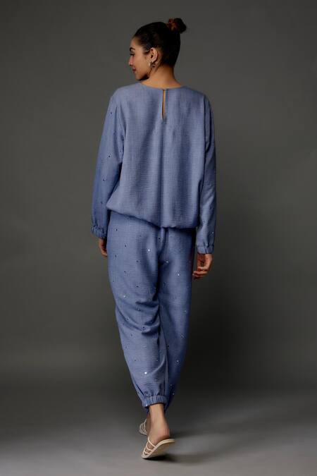 Grey linen top featuring round neckline, long sleeves, and mirror embroidery. Paired with matching joggers that have an elasticated hem and mirror embellishments.