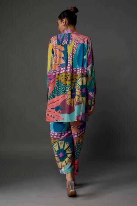Purple Crepe Printed Tropical Collared Shirt And Pant Set