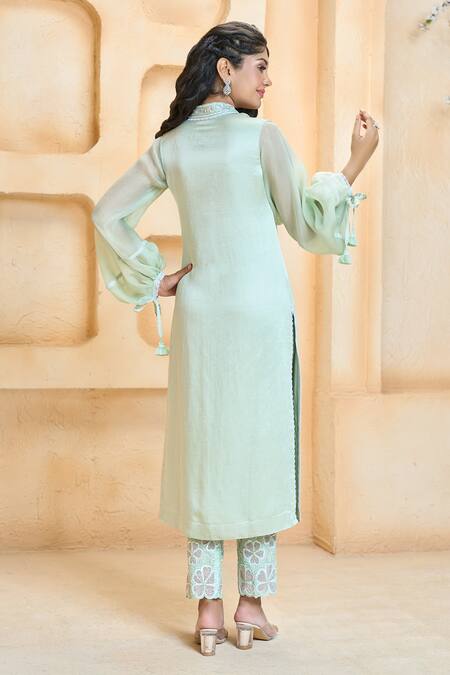Aquamarine embroidered kurta featuring pearl and sequin detailing on the neckline and organza puff sleeves. Paired with floral embroidered hem pants and tassel tie-up sleeve hems.