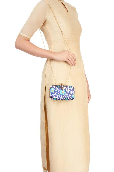 Blue floral printed box clutch with a small silver lock at the front. Comes with a clasp and a long chain handle.