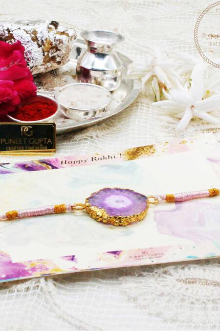 Gold rakhi featuring a handpicked pink agate semi-precious stone with gold plated edges