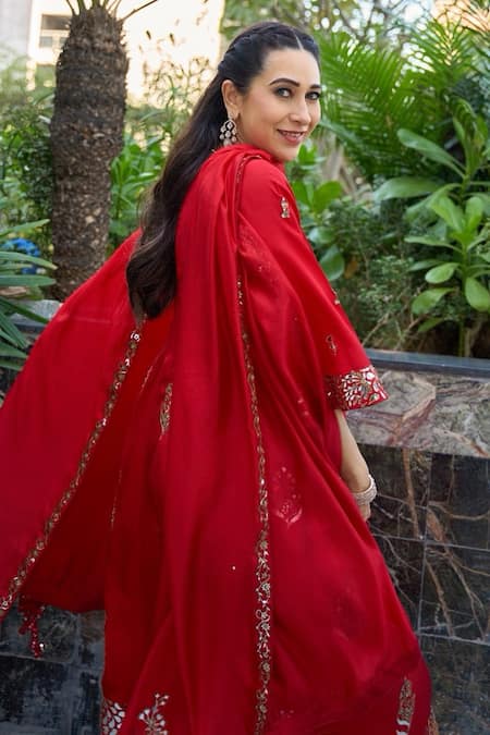 A Surkh Laal choga kurta crafted from silk, featuring bell sleeves and patra work embroidery. It is paired with coordinating silk pants and an organza silk dupatta with chandi tilla embroidery.
