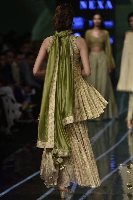 Green anarkali kurta with all over bandhani print and placement work. Comes with tiered gharara and dupatta.
