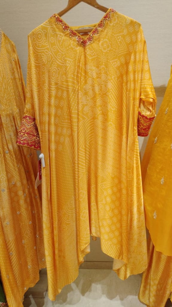 Mustard kaftan featuring an all-over bandhani print crafted in satin silk. Paired with a matching bandhani print pant, adorned with resham and coin work on the neckline and cuffs.