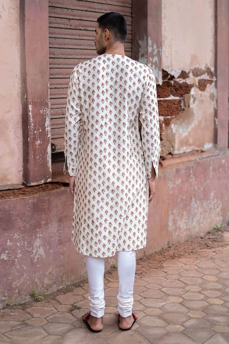 White kurta in silk chanderi featuring all-over floral block print and a notched neckline. Paired with a churidar and an embroidered stole with decorative borders.