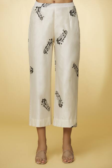 Ivory chanderi silk anarkali featuring a U neck and three quarter sleeves. Paired with straight fit pant and handloom chanderi dupatta with scalloped cut work border.