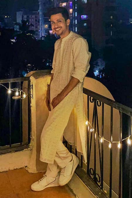 White straight kurta with resham embroidery and sequin work. Comes with churidar.