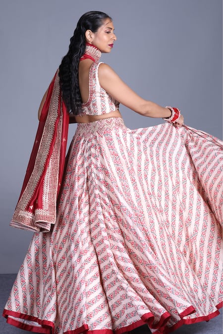 Buttercup cream lehenga with all-over floral printed motifs in striped pattern. Comes with blouse & red embroidered dupatta.
