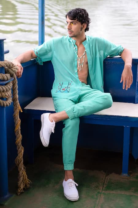 Turquoise cotton shirt featuring floral printed pockets and cuffs
