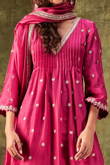 Pink , Organza Dori And Mirror Work V Neck Embroidered Anarkali Pant Set