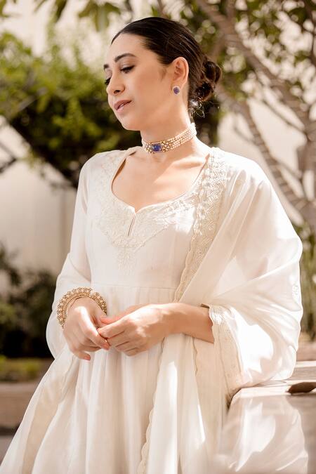 Ivory anarkali with resham, patra & leather patch work. Paired with organza silk dupatta & churidar.
