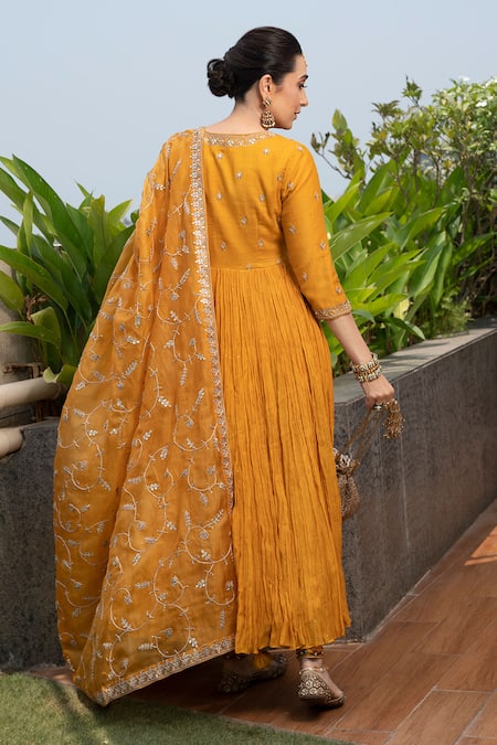Mustard yellow anarkali featuring gota & marodi embroidered yoke & sleeves. Paired with embroidered dupatta & chanderi pant.