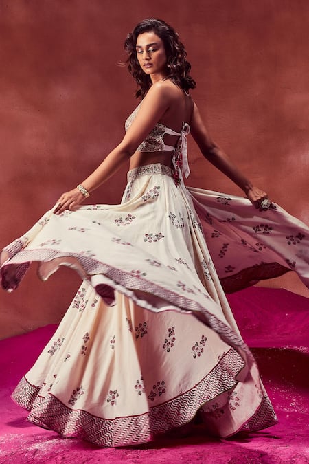 Ivory Hand Block Print, Marodi And Zardozi Halter Lehenga Set