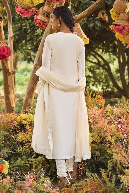 Ivory kurta in handloom chanderi base fabric featuring resham, patra & leather patchwork. Paired with churidar & dupatta.