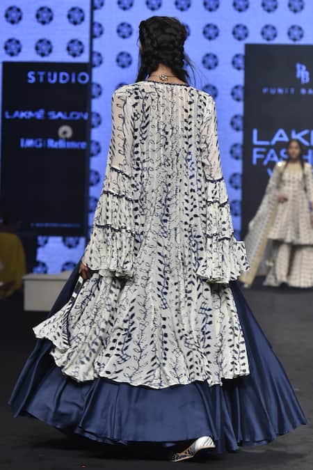 This ultra-mod luxurious lehenga set is a refreshing, mod shift from your timeless classics. Showcasing a blue hued bralette coordinated with a matching lehenga and an ivory-hued, flared sleeves embroidered jacket.