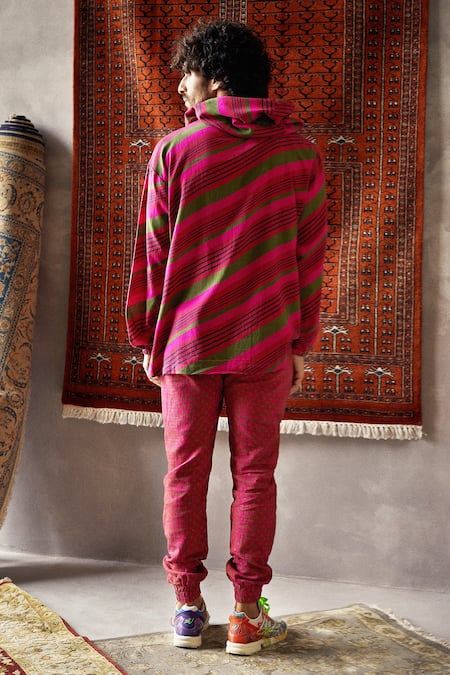 Cherry red oversized hoodie with all-over print in striped pattern. Comes with joggers.