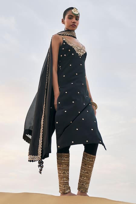 Black kurta featuring mirror and salma embroidery with a scoop neckline. Paired with an embellished churidar and a cutwork bordered sheer dupatta.