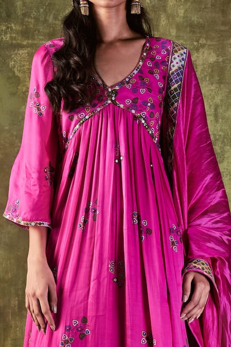 Pink printed satin silk printed anarkali with placement embroidery. Paired with dupatta & cowl pant.