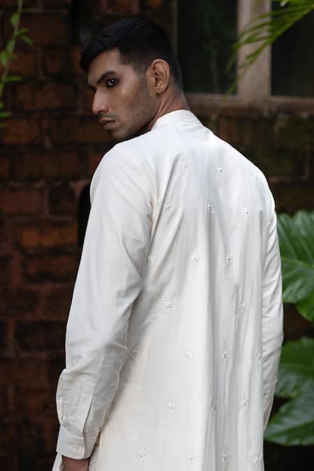 White chanderi silk kurta featuring resham and mirror embroidery with full sleeves and a band collar. Paired with matching embroidered pant and side pockets on the kurta.