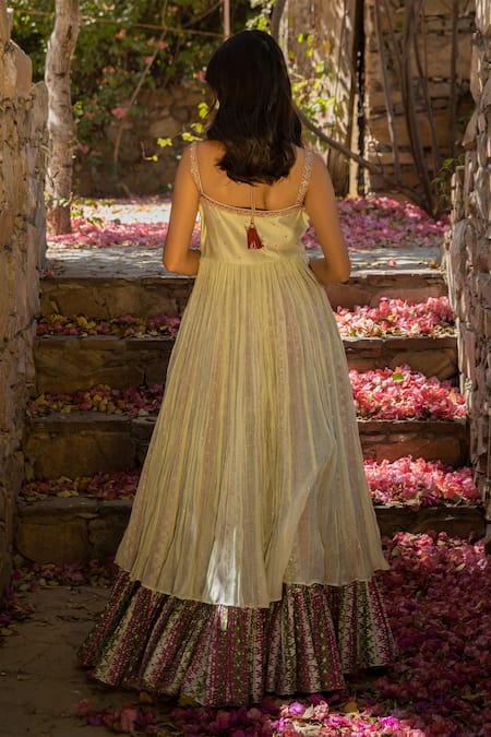 Mint green crushed flared long kurta with hand worked marodi embroidery. Comes with flounce hem printed gharara pants.