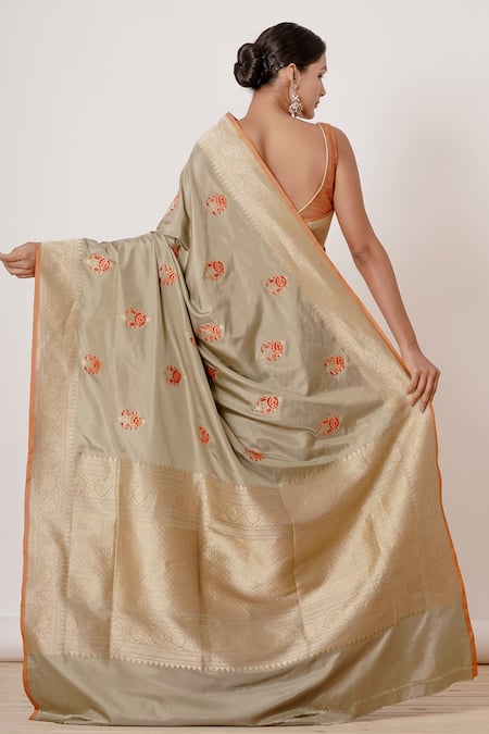 Olive gold banarasi silk saree with orange floral motifs all-over and thick zari border. Comes with rust blouse with quilted thread work.
