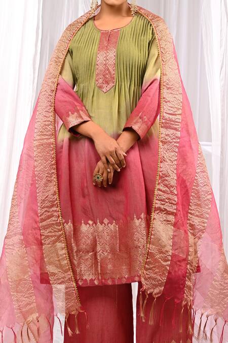 Green to wine ombre pure chanderi A-line kurta featuring real zari and banarasi weaving with a pintucked yoke. Paired with palazzo and a frayed tassel hem dupatta.