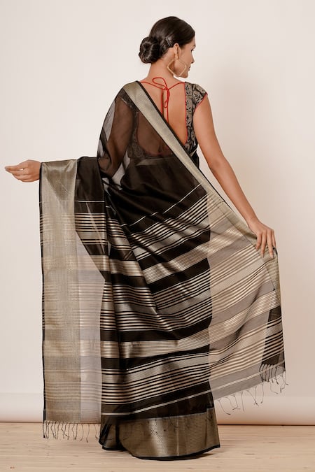 Black handwoven chanderi saree with thick gold Naramada river inspired lehar border and zari lines all over the pallu. Comes with a black and beige jacquard blouse.