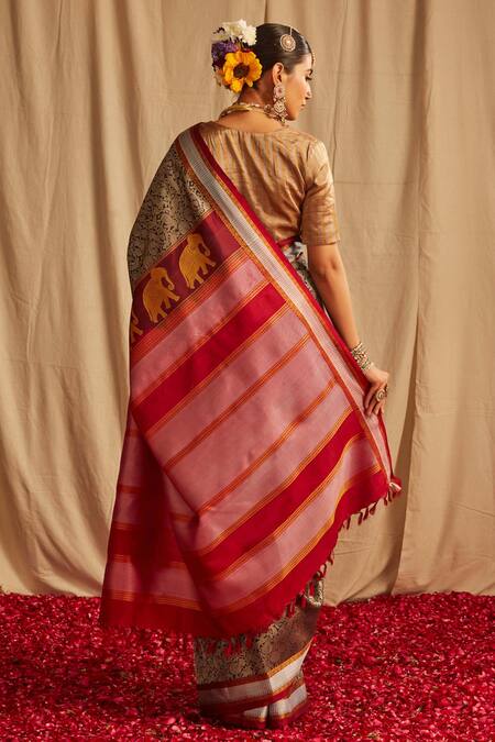 Fringed hem palla, Woven animal motifs, Contrasting maroon border
