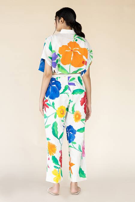Off white drawstring balloon crop top featuring bloom hand painted motifs and front buttons