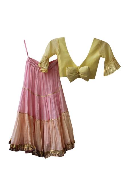 Yellow blouse featuring flared sleeves and a V neckline. Paired with a shaded lehenga adorned with gota patti embroidery.