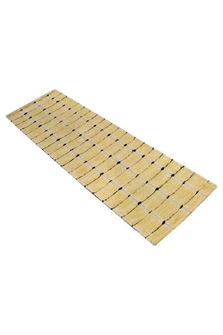 Yellow rectangular shaped handcrafted rug with cut pile finish with embossed checkered pattern.