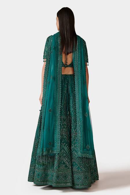 Emerald green lehenga with velvet applique and all-over crystal, beads, sequins and Swarovski embroidery. Comes with V-neck blouse and net dupatta.
