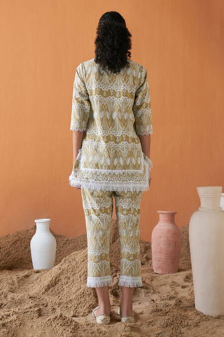 Green Cotton Tassels, Embroidery Round Neck Flora Schiffli Top And Pant Set