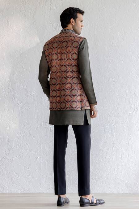 Black base sleeveless front open nehru jacket with all over kashmiri floral embroidery. Paired with an inner olive kurta and trouser.