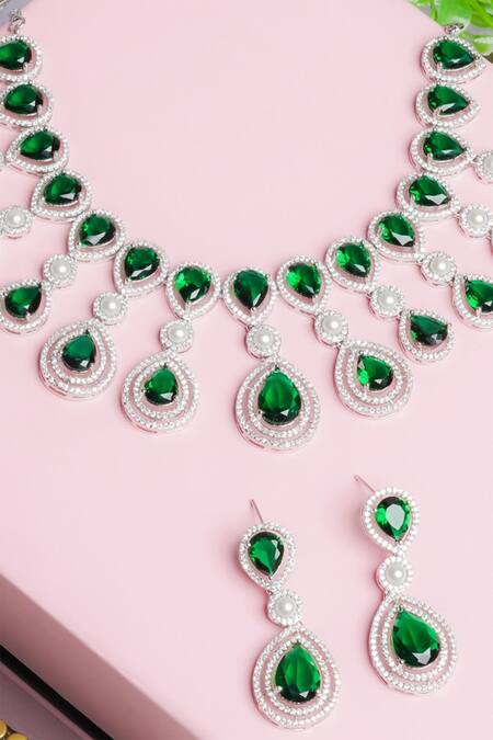 Emerald Green Diamonds, Pearls Drop Stone Embellished Necklace Set