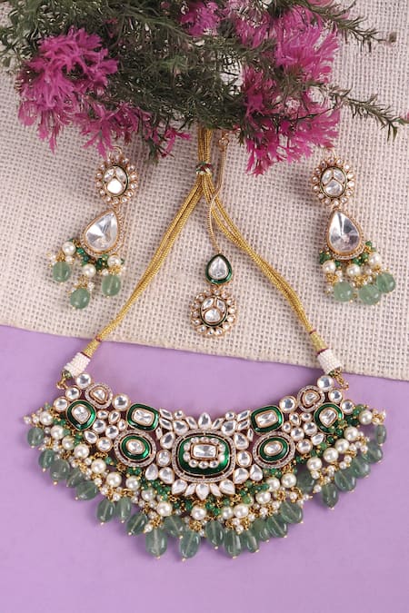Green bridal kundan choker featuring intricate stone work and dangling beads. Accompanied by matching earrings and a maangtikka with similar embellishments.