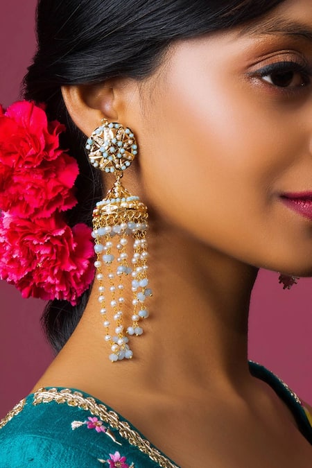 Gold plated jhumkas featuring white and phiroza bead tassel embellished drops