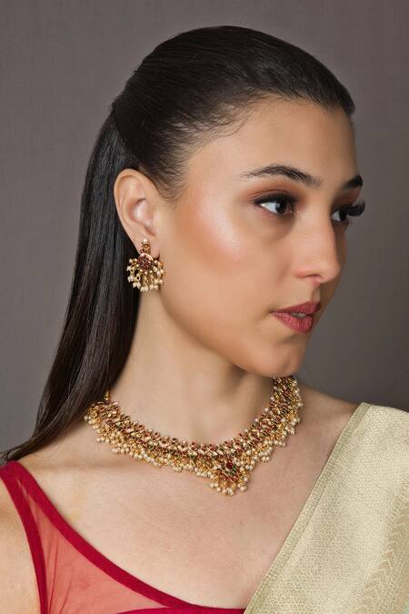 Gold plated temple carved choker featuring stone embellishments. Paired with matching earrings designed to complement the choker.